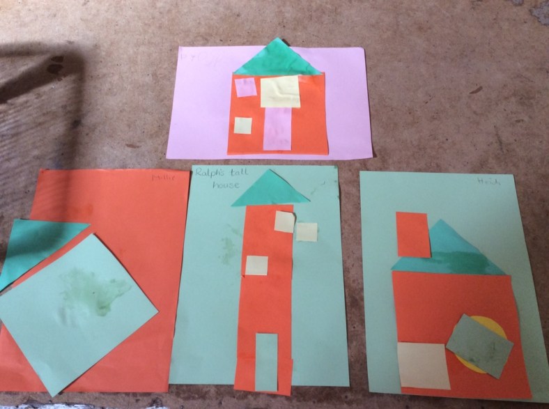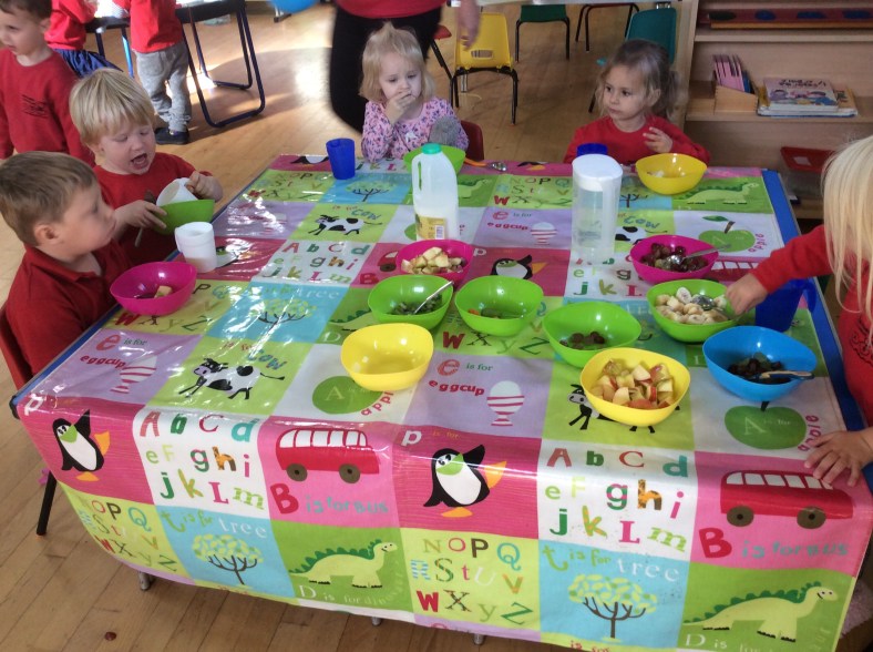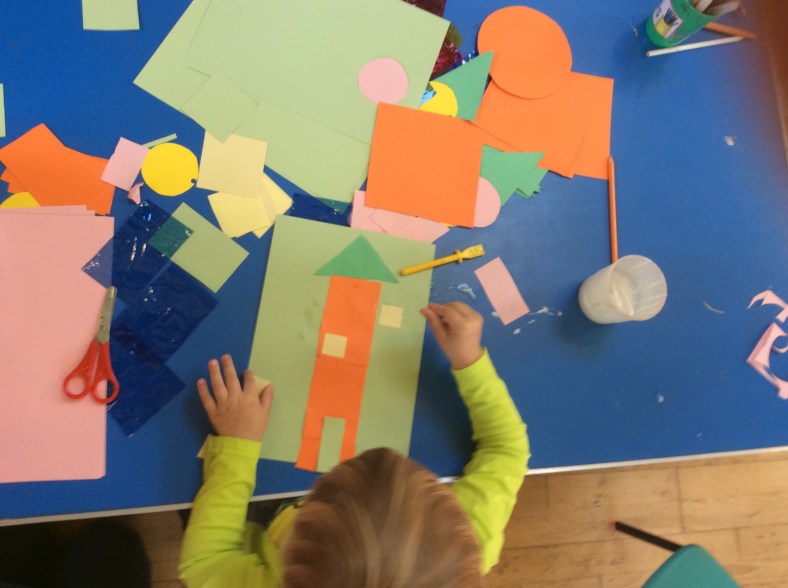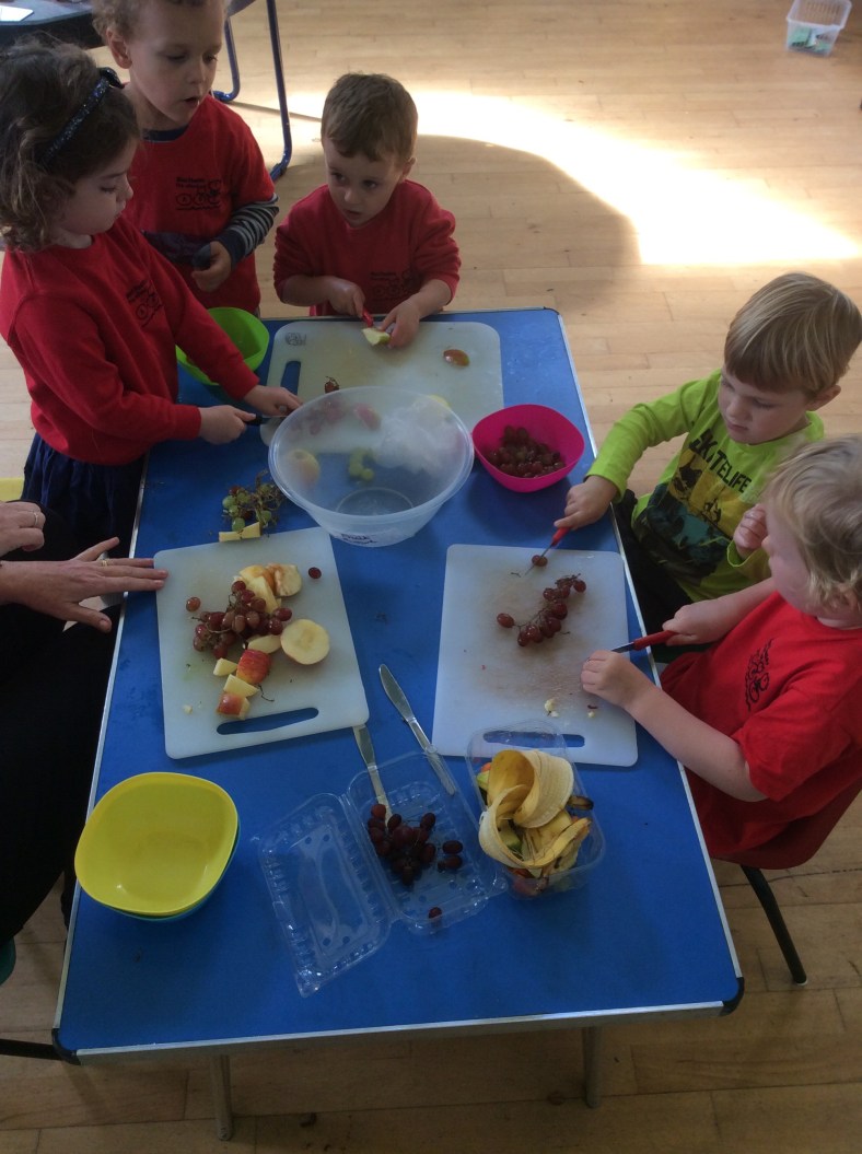 Today’s shape activities included making our houses out of pre-cut shapes. The children also took it in turns cutting our snack time fruit into circles, oval, rectangles and squares. Our cutting fruit exercise was not only great for learning our shapes it also helped to develop social skills, hand eye coordination, communication and learning about healthy eating.