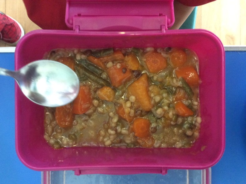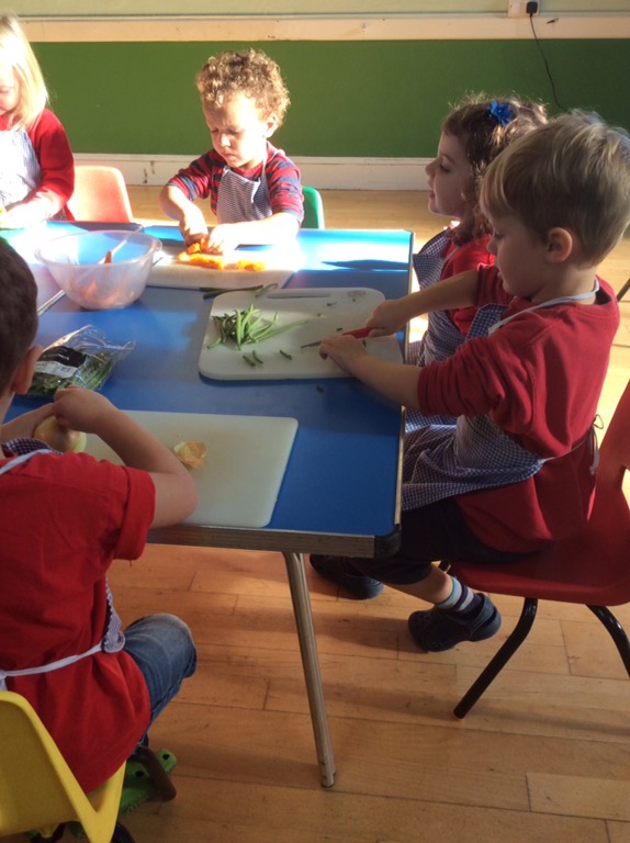 After everyone had arrived we washed our hands and put our aprons on. We all started preparing our soup ingredients. The children joined in peeling and chopping the vegetables ready to be cooked. We talked about each vegetable, how it grows, it’s colour and what it feels like. We used butternut squash, carrot, onion and green beans and also added barley and lentils. We talked about heating the vegetables using oil and hot water.