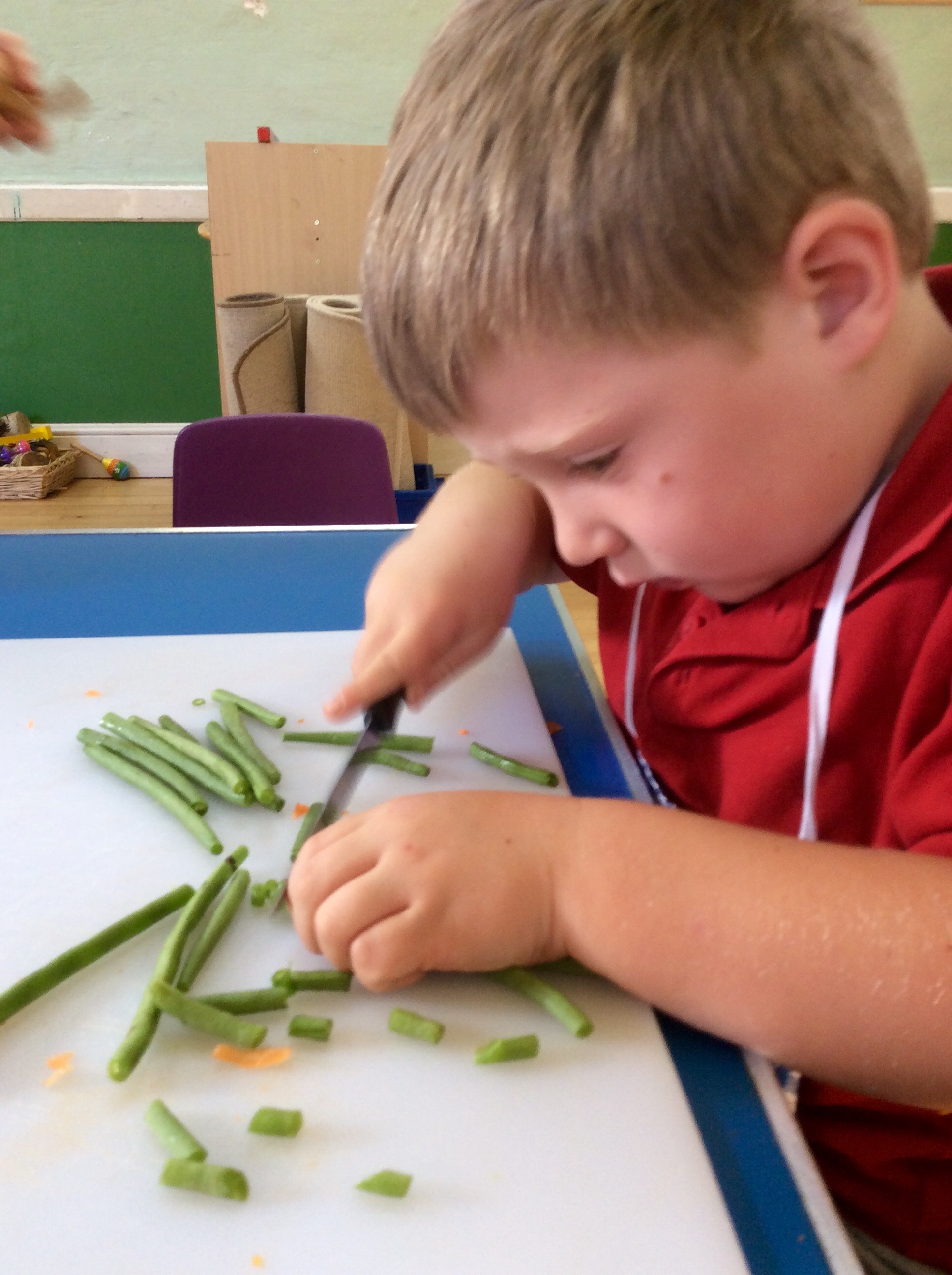 After everyone had arrived we washed our hands and put our aprons on. We all started preparing our soup ingredients. The children joined in peeling and chopping the vegetables ready to be cooked. We talked about each vegetable, how it grows, it’s colour and what it feels like. We used butternut squash, carrot, onion and green beans and also added barley and lentils. We talked about heating the vegetables using oil and hot water.