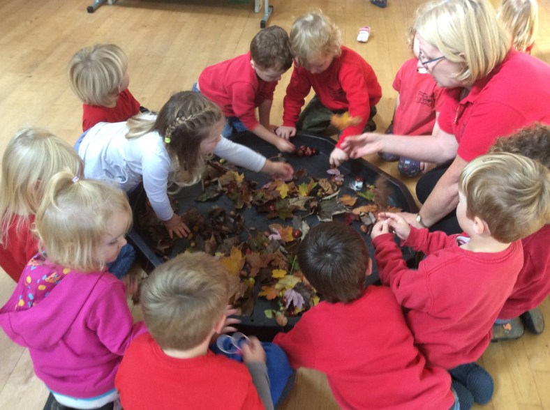 We went for a lovely walk today to Finche Field to look for signs of Autumn. The children collected acorns, pine cones and a varied selection of leaves. While we were outside we had the chance to talk about the life cycle of an Oak tree and that squirrels enjoy hiding and eating acorns. Our Autumnal walk covers the EYFS area of ‘understanding the world’, encouraging the children to look at the environment around them ask questions and arouse awareness of nature. At Circle Time we placed all the items we had collected into our tray (including items some children had bought in from their own walks) so that we could pick them up. The children could feel the texture of the leaves, conkers and acorns. We discussed what they felt like and the colours of each item.