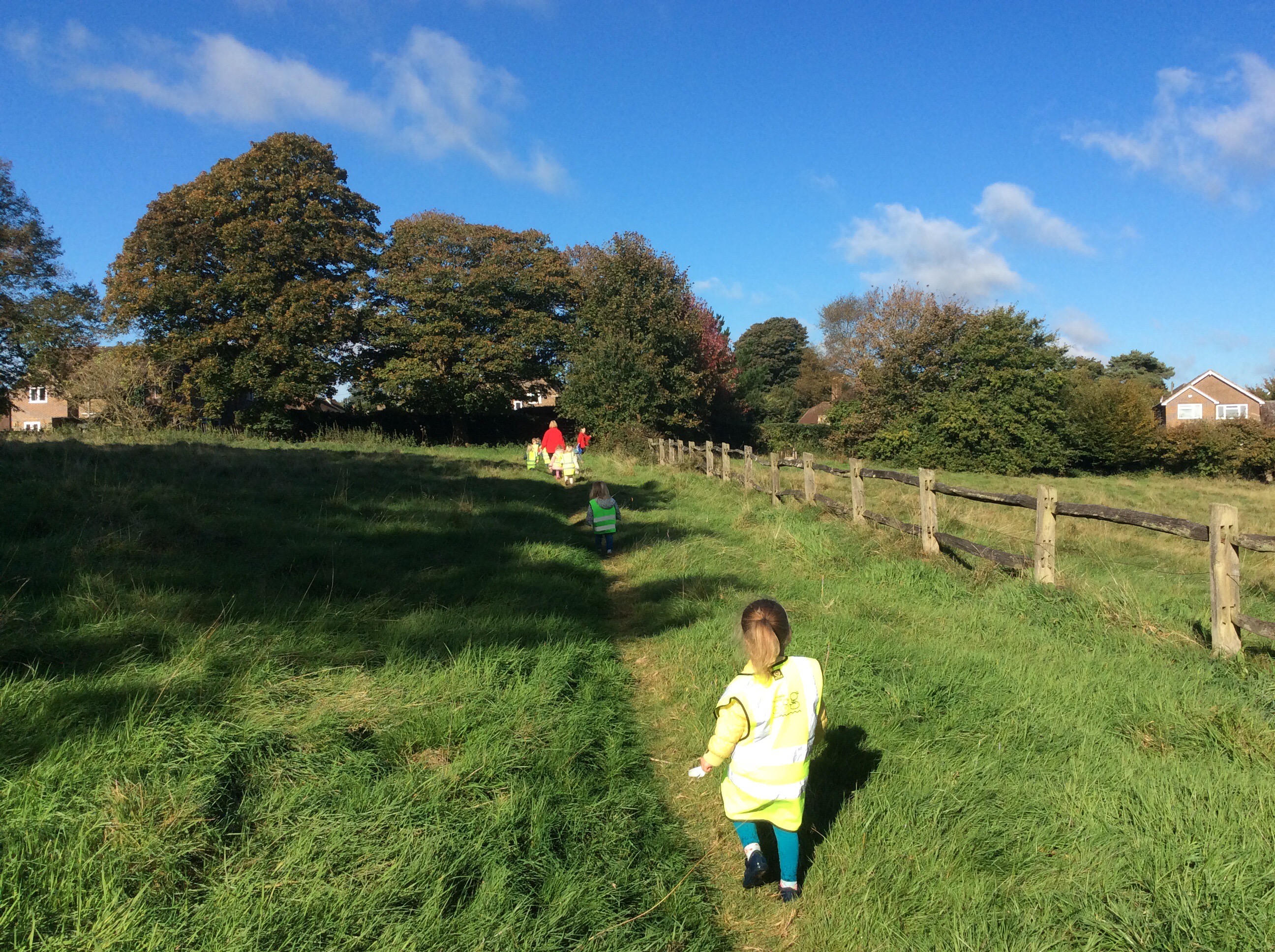 We went for a lovely walk today to Finche Field to look for signs of Autumn. The children collected acorns, pine cones and a varied selection of leaves. While we were outside we had the chance to talk about the life cycle of an Oak tree and that squirrels enjoy hiding and eating acorns. Our Autumnal walk covers the EYFS area of ‘understanding the world’, encouraging the children to look at the environment around them ask questions and arouse awareness of nature. At Circle Time we placed all the items we had collected into our tray (including items some children had bought in from their own walks) so that we could pick them up. The children could feel the texture of the leaves, conkers and acorns. We discussed what they felt like and the colours of each item.