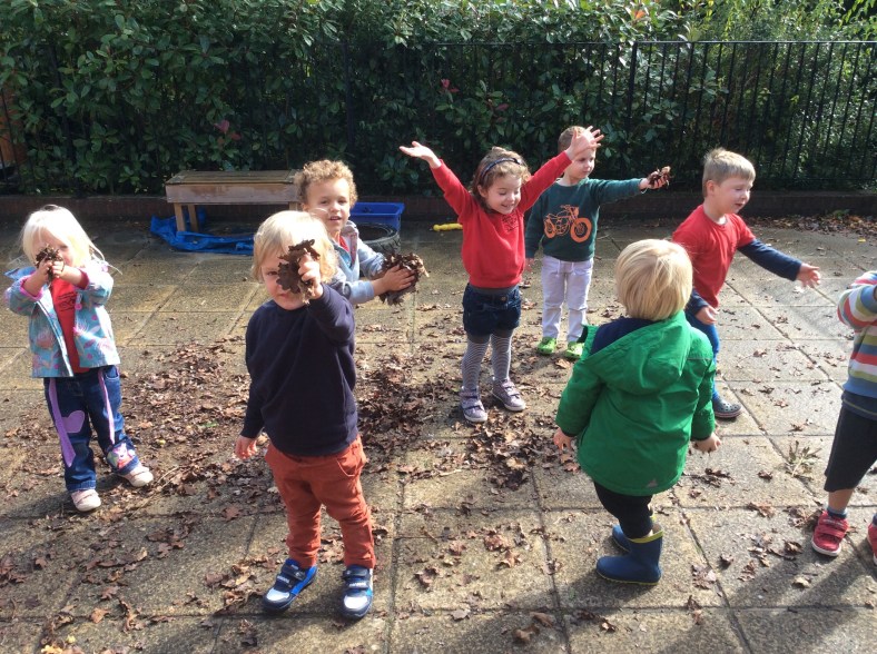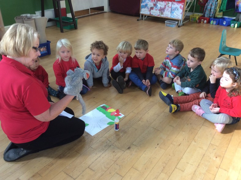 At Circle Time Issy read the children her story about squirrel and how he was sad when the leaves fell to the ground, but he learnt that they grow again in spring. The children were looking at the colours red, orange, brown and green. Also the life cycle of trees and seasons.