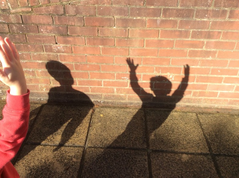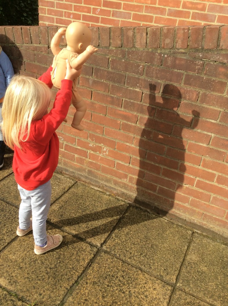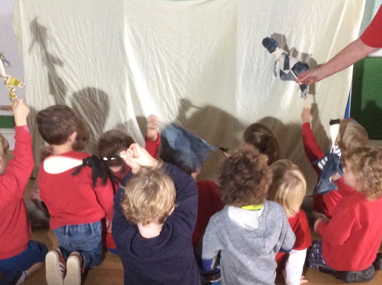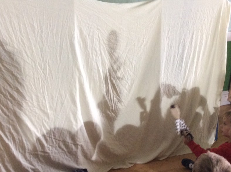 This week we are investigating light and dark. Today we made wooden spoon puppets with Issy. Issy helped to cut out the clothes, and some of us stuck hair made out of wool. After Circle Time we set up a sheet and a bright light and used our hands or puppets to make different shapes. We also went outside when the sun was shining and looked at our shadows and silhouettes.