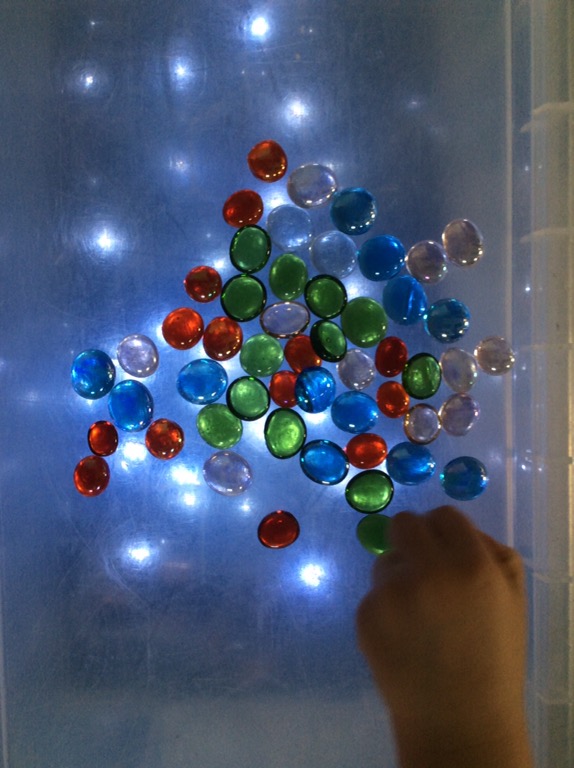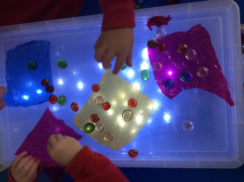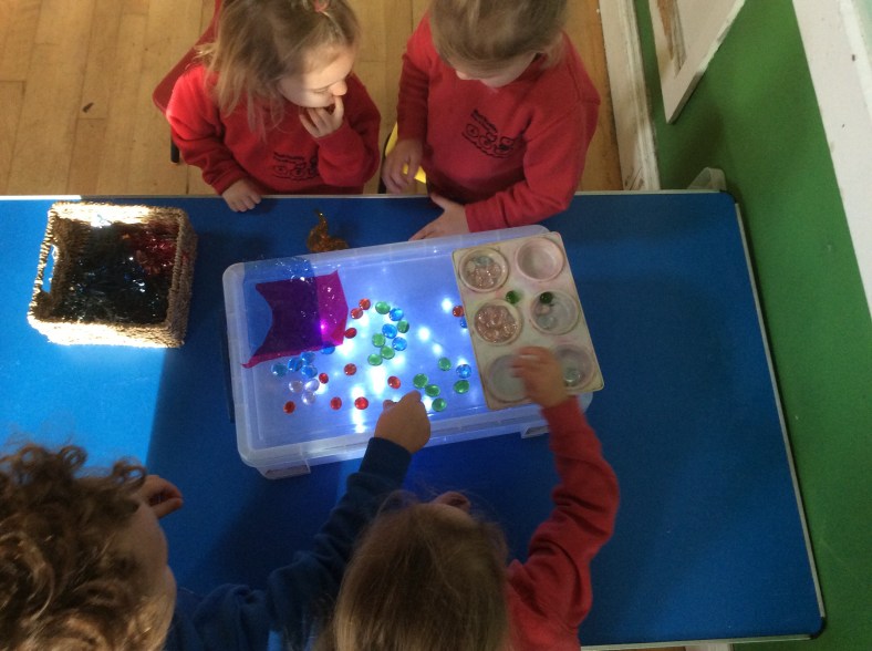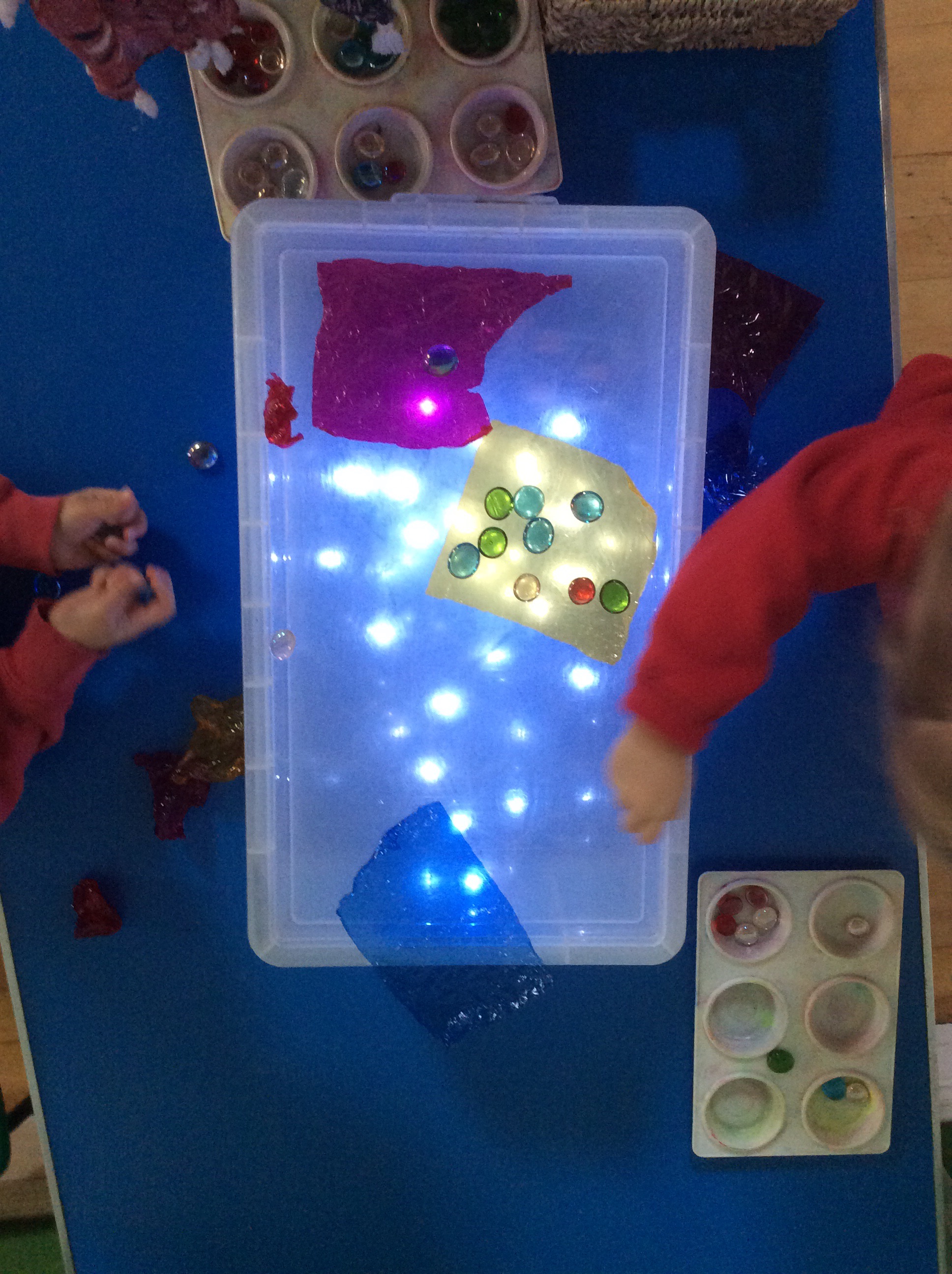 Today we continued our theme this week and made a light box. This is something fun and easy that can be done at home too. We used a small clear plastic storage box with some battery operated fairy lights. The children were really excited by it and all wanted to come and have a look. We used coloured glass beads and coloured cellophane to make patterns. We extended play by racing to see who could pick up a chosen colour of beads the fastest. It was a fantastic way for the children to explore, investigate and be creative.