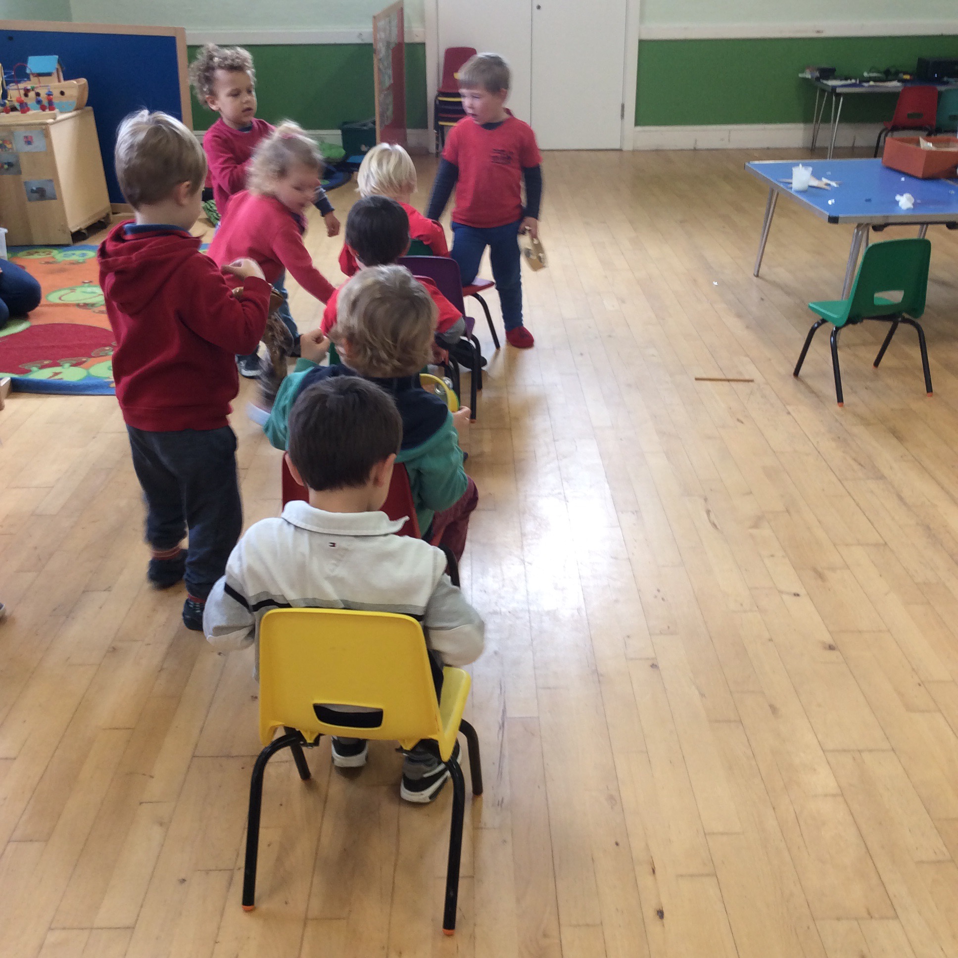 We’ve had lots of imaginative play so far this week. Someone bought in a box this week, the children jumped straight in it creating a car, a bus and a plane. The children used felt pens and pencils to create switches, buttons, wheels and holes. The children continued this theme by creating a train using chairs and a tambourine as a steering wheel. Later they moved the chairs to a different formation and they now had a plane!