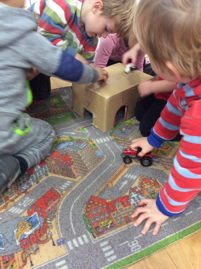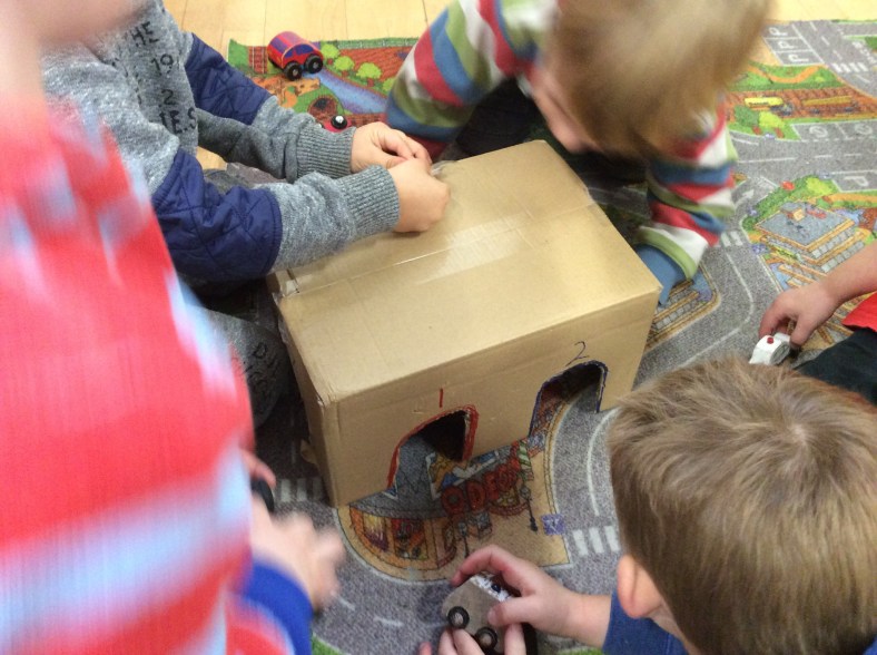 We had another cardboard box today so created tunnels for the small vehicles, each tunnel had a number and colour. The children helped to choose the colours.