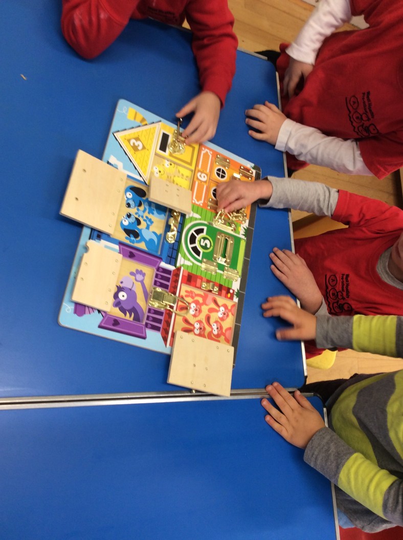 We have bought a new Latches Board which the children were really keen on using for the first time today. The board has multiple levels of learning, not only does it work their fine motor skills carefully opening and shutting the various types of latches and doors, but also helps with number recognition, colours and animals. We also had the gears out on the large mat, so that the children could develop their gear designs.