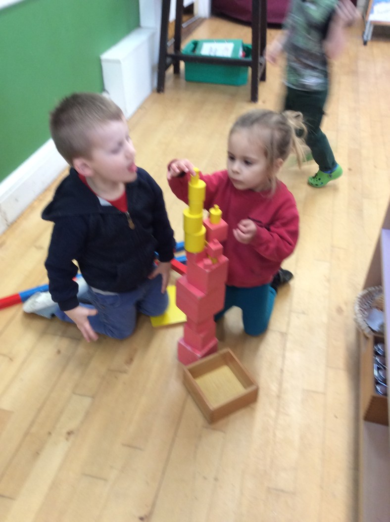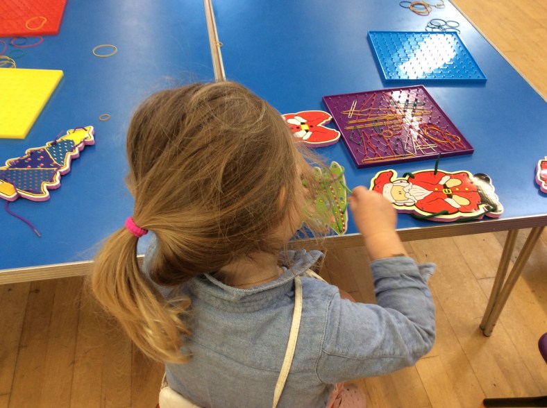 Today we have used the small world farm animals. The children worked together to create their own farmyard. A great way to enrich their imagination and explore the world around them. We also had our festive threading out and the very popular Geoboards for fine motor skills.