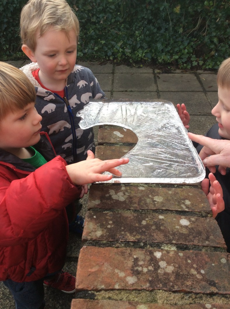 We made the most of the lovely sunny weather yesterday and were outside playing in the garden. The children were really interested in the places where the water had frozen. We discussed the ice and why places in the garden had frozen. The children loved looking and touching the ice, it’s texture and how it smashed on the ground.