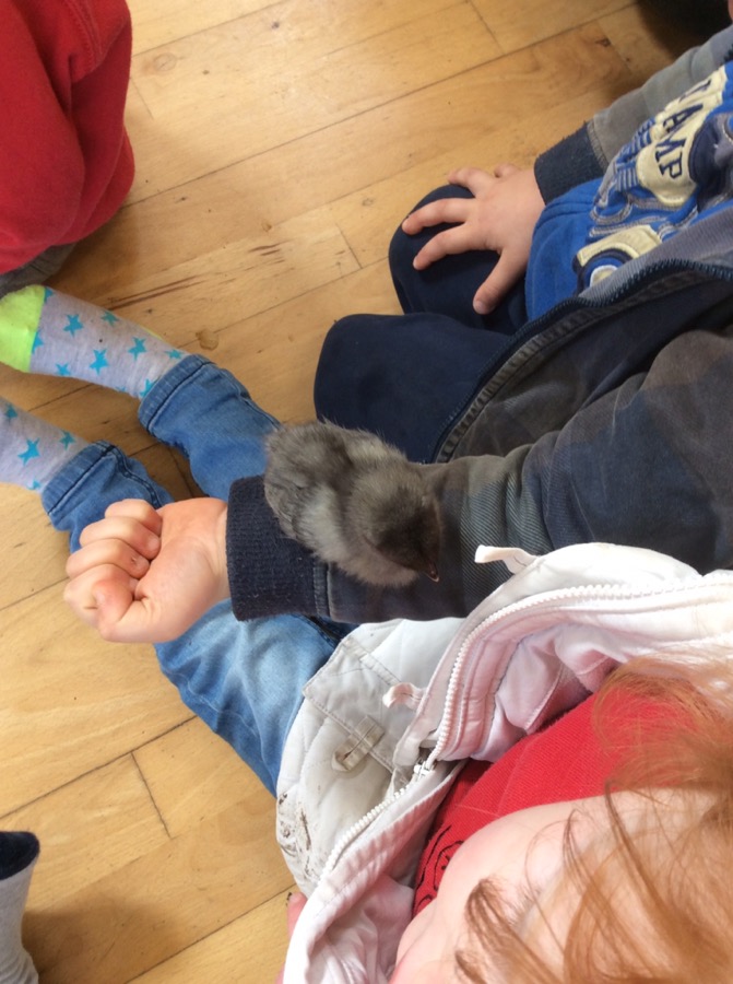 We also had a visit from five day old chicks, one of our parents kindly bought in the chicks for the children to handle. The children held them and were all very gentle with them. They also sat back and watched and listened to the sound they made and how they moved.