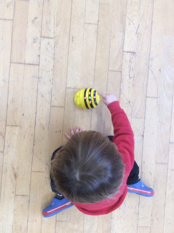 Today we used the Beebot. The Beebot is an exciting robot the children can program using directional buttons on the top. It’s great for encouraging use of directional language, sequencing and learning about estimation. Some of children used it to estimate the width of the hall. They correctly estimated the amount of movements across the hall, and were very excited about their accomplishment.