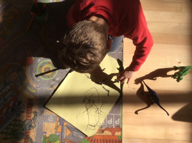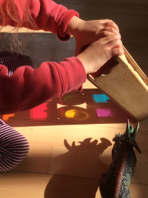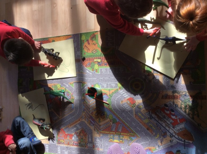 We have been doing lots of interesting things with dinosaurs so far this week. We have a tuff tray full of leaves and twigs for the small world dinosaurs to explore. Lots of imaginary play has been going on over here, and lots of roaring! The sun was shining in through the windows this morning so we used this to create some dinosaur shadow pictures. A great way for some of the children to practice their pen and pencil control, gently tracing round the bumpy edges. This shadow activity also lead some of the children to use one of the toys with transparent coloured shapes. They placed the toy in the sun looking at how it changed the colour of the floor. In the creative area we have been experimenting with the playdoh. There has been lots of covering of dinosaurs, imprinting them in the playdoh and footprints. At Circle Time we looked at the size of dinosaurs. Issy helped the children measure out the smallest and largest.