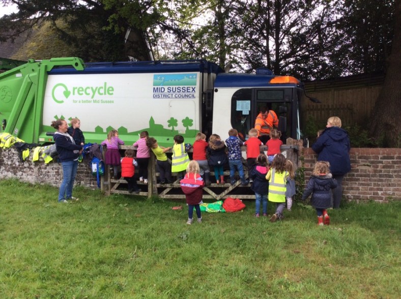 Once it had stopped raining we got to spend lots of time outside in the field opposite the hall. We played tag and football, some of the children collected sticks to make a fire. We also used the parachute which involved everyone working together to keep the balls on. The highlight of the morning for most of the children was the dust cart driving along the road. All the children rushed to the wall to wave to the driver.