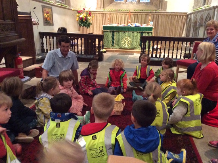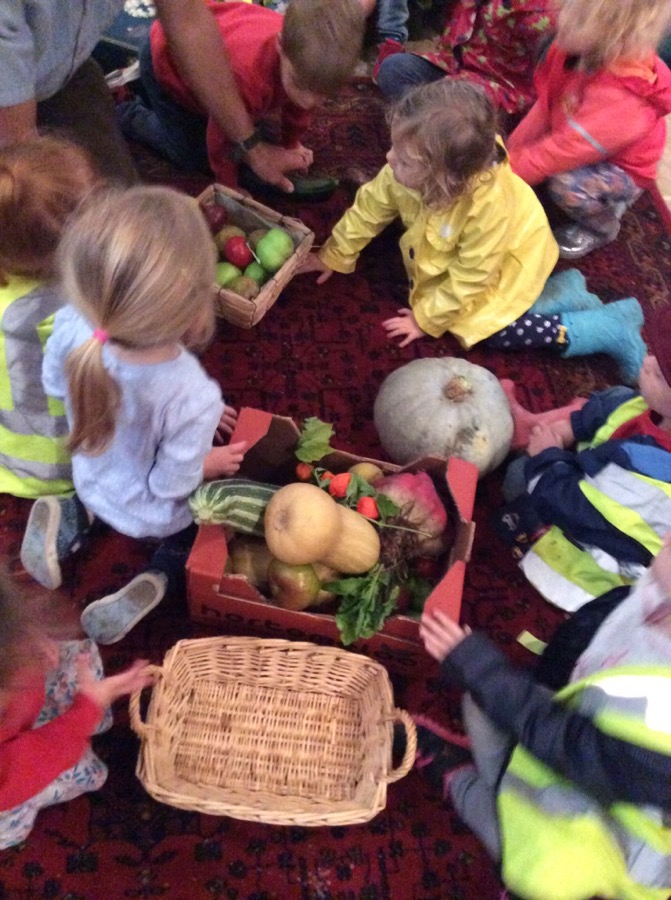 We have visited the church to talk about harvest, where our food comes from, helping others and had fun collecting food around the church. We also made apple crumble to take home for lunch.