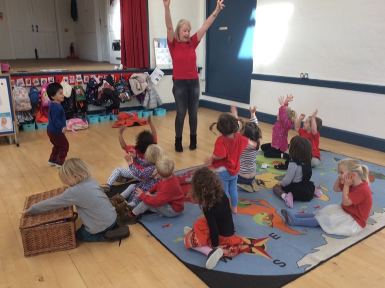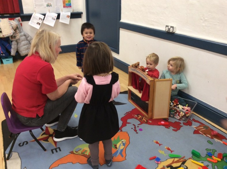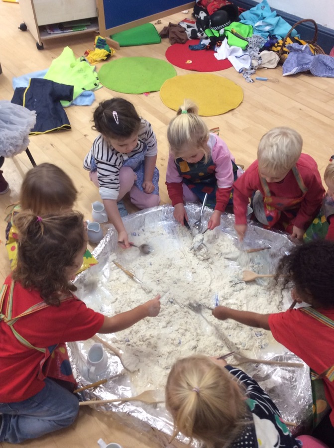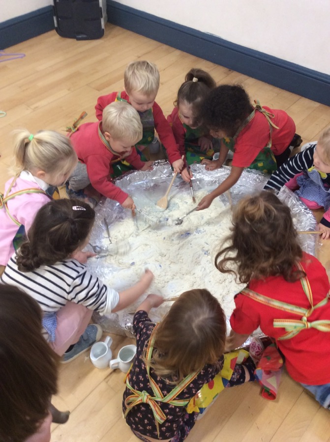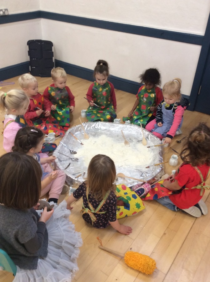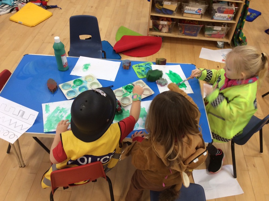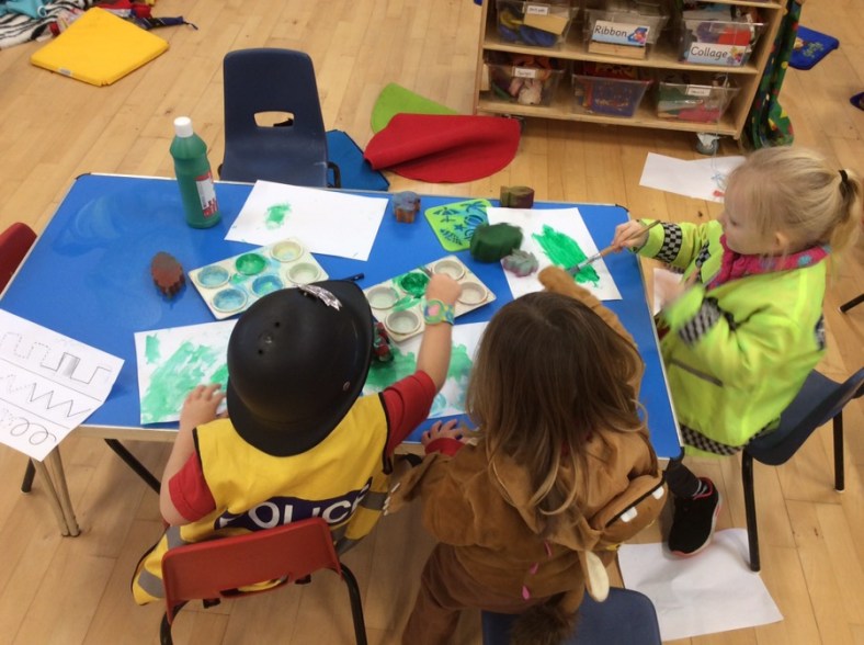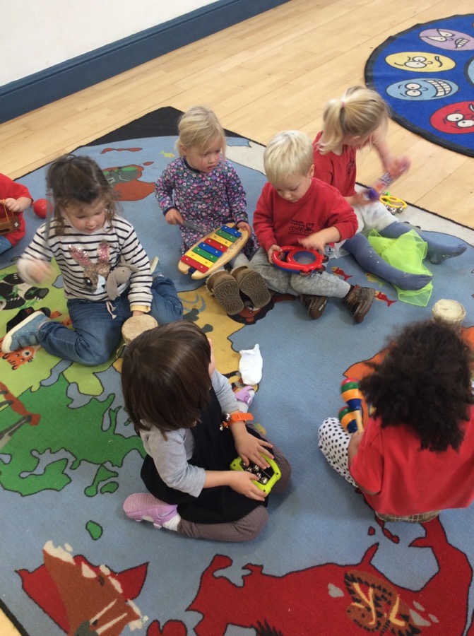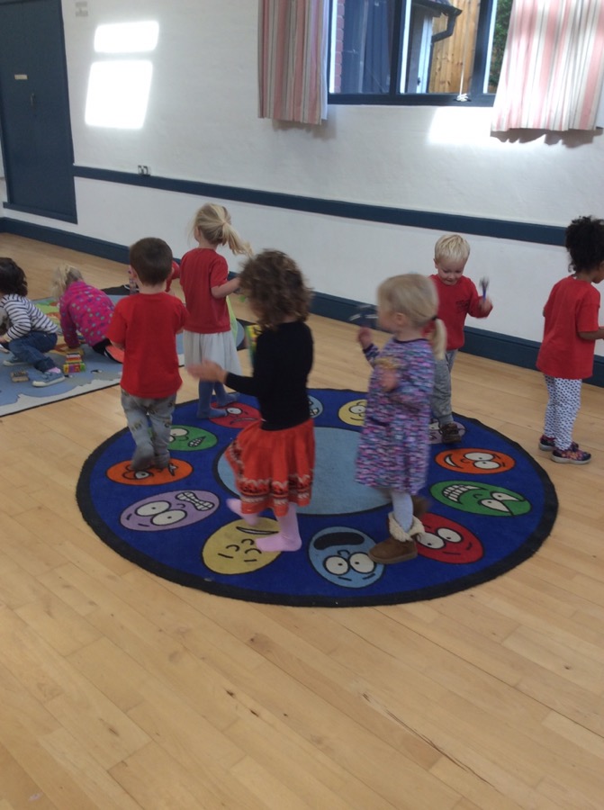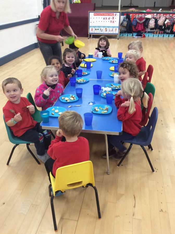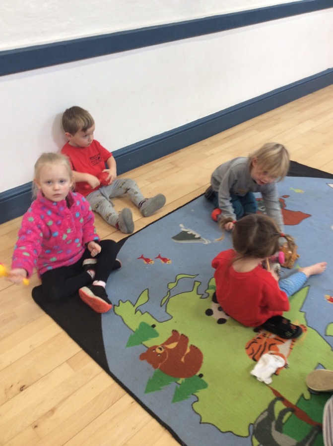 This week we’ve have been having some musical fun with instruments and dance. During messy play we mixed water and flour together with different colours and looked at colour changing. We used different utensils to mix it all up and had a great time getting messy! We’ve been painting, dressing up and creating puppet shows wi the finger puppets. Here is a photo of us all during snack time together too.