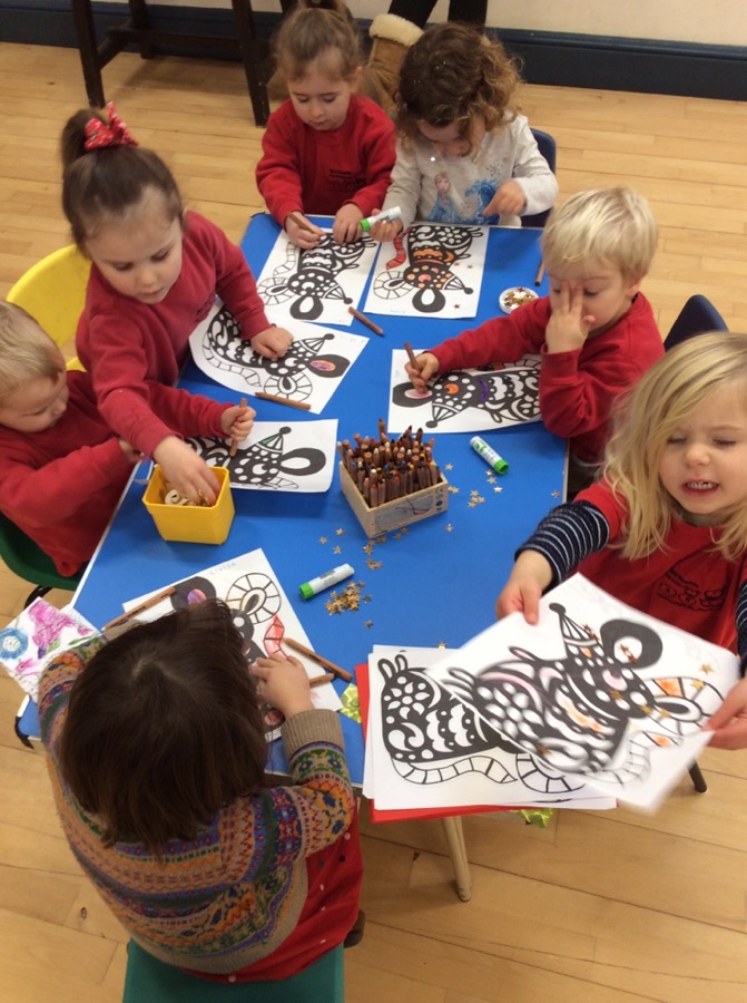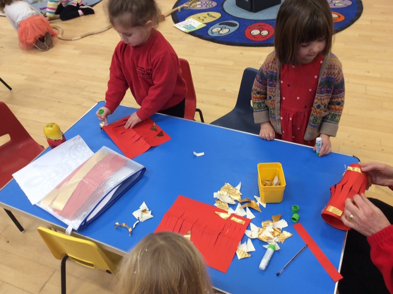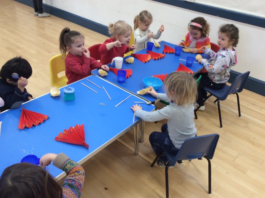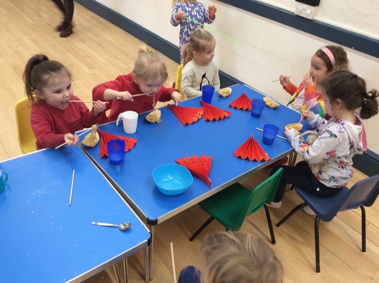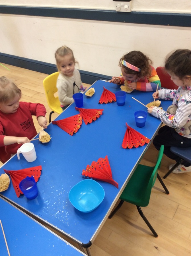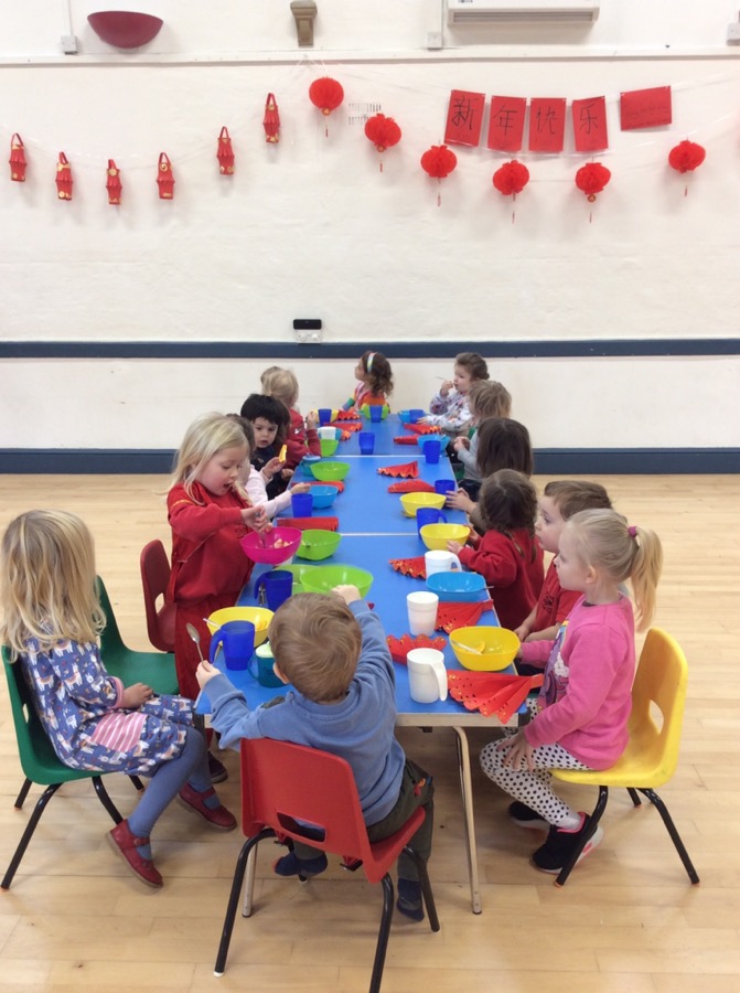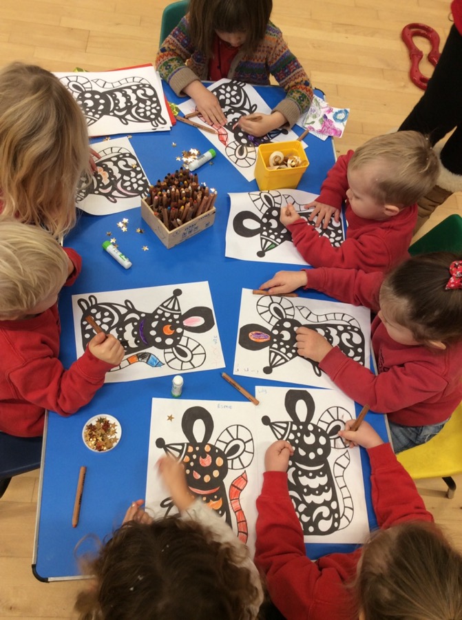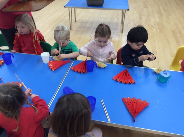 We have been having lots of fun this week learning about Chinese New Year. The children have made lanterns and fans, they have also been colouring and decorating a picture of a rat as it’s the Chinese Year of the rat. We have done some Chinese dancing. They have been writing their names in Chinese and on Wednesday we had noodles for snack and they were a big hit!