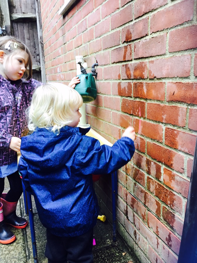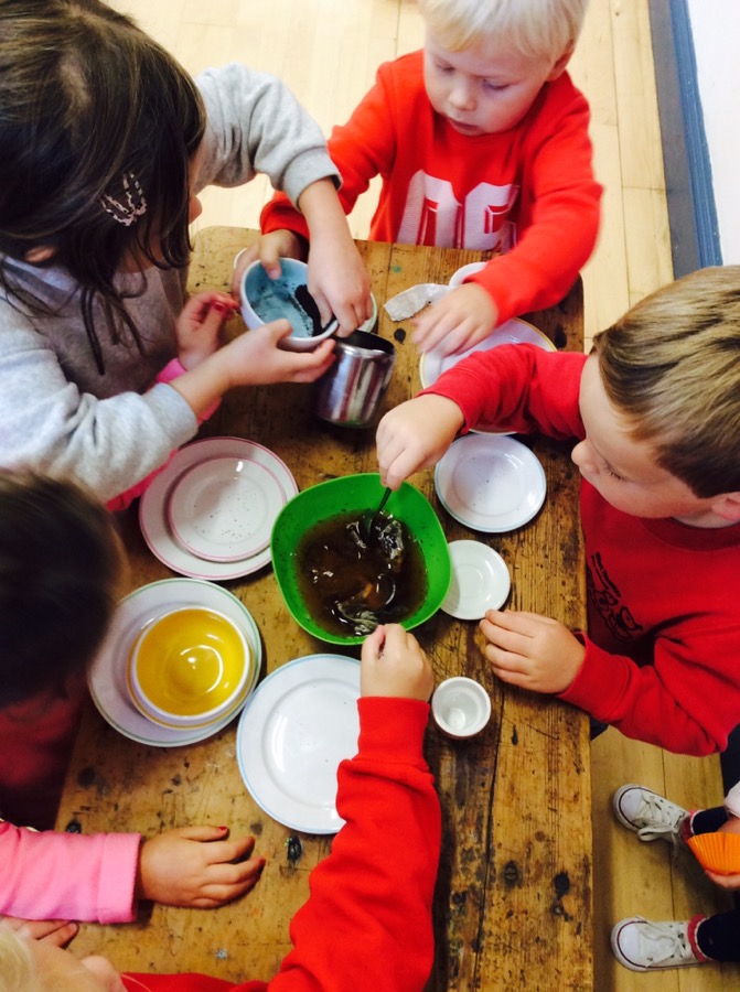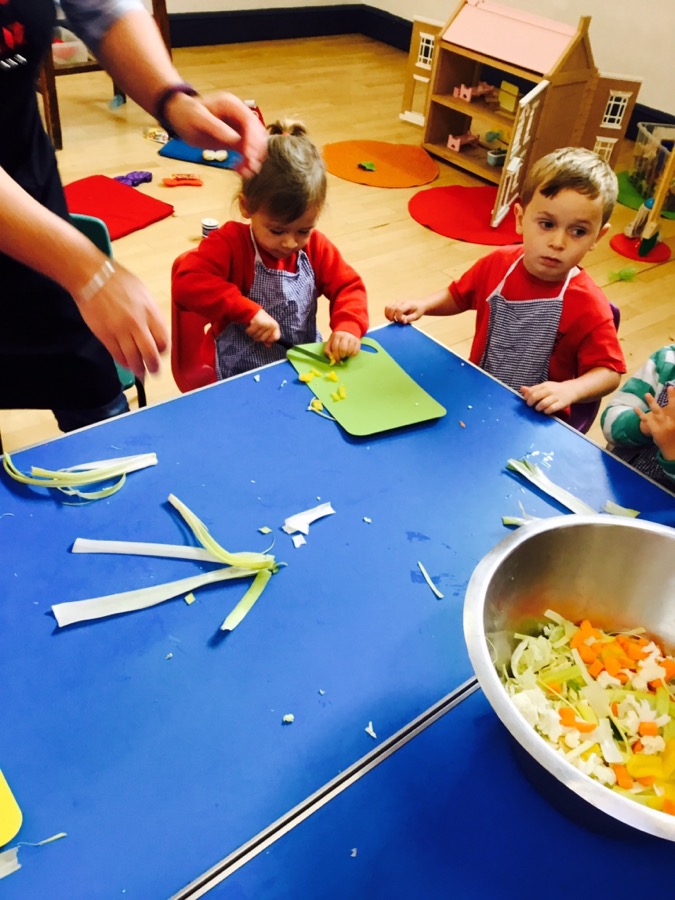 We made soup, chopping and identifying the different vegetables. The children were making imaginary cups of tea so we got out teabags and talked about how we make a cup of tea, where tea comes from and what’s inside a teabag. We ripped them open and mixed the leaves with warm water and watched the water change colour.