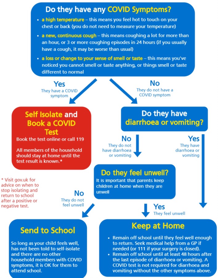 If you suspect your child or anyone in your household has the symptoms of Covid 19 you must book a test and your family should stay at home until the test results are returned. Please check the NHS website for more details and how to book a test.