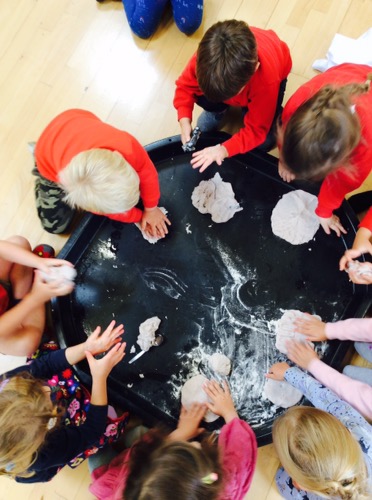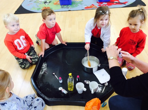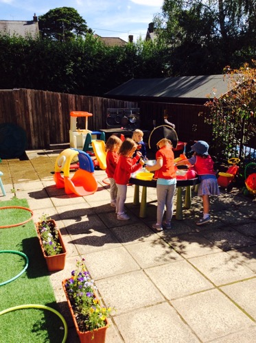 Issy worked with some children looking at ‘dissolving’ using warm water, salt, sugar and sand. The children tested which dissolved and which didn’t. They wore their lab coats and glasses to role play as scientists too.