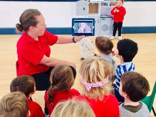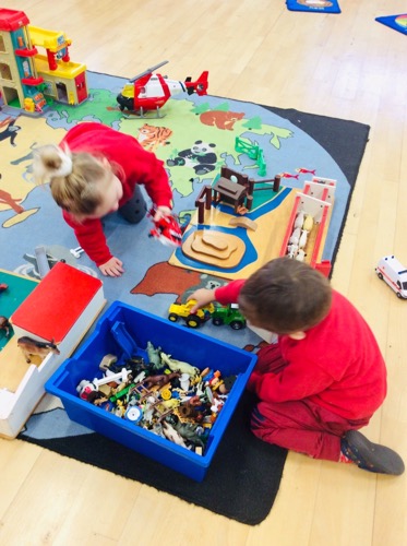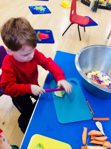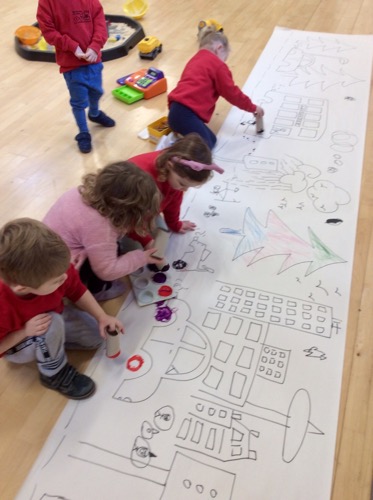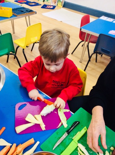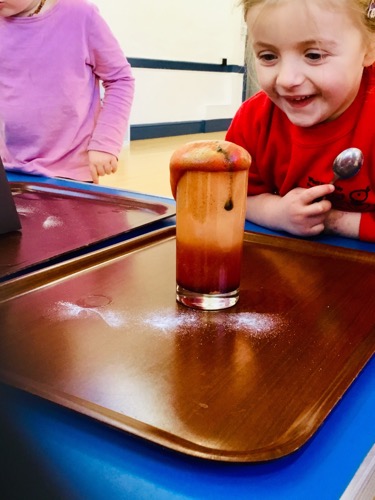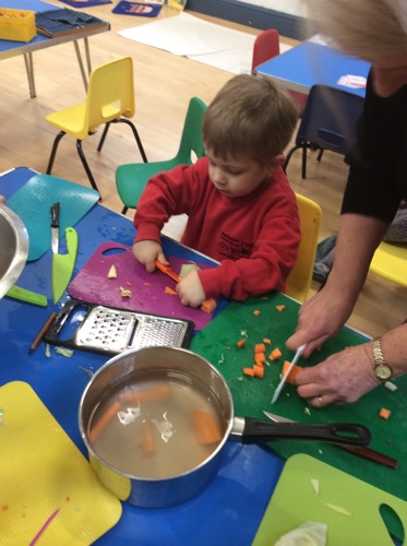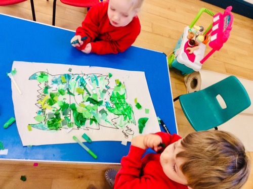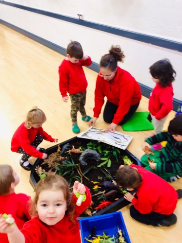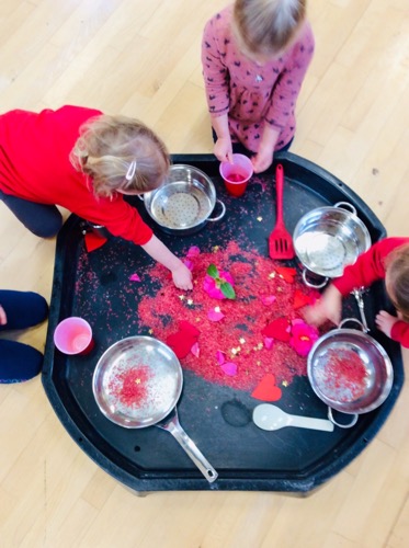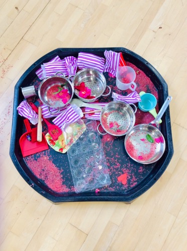 We wanted to share one of our favourite sensory tray activities. Today we used coloured rice in our tray, we started with saucepans, different types of spoons, flowers from the garden and jugs. As the morning went on and the children’s interest developed we added other items such as paper bags a plastic tray with small compartments to fill. We sometimes fill our trays with flour, water, mud, paint etc