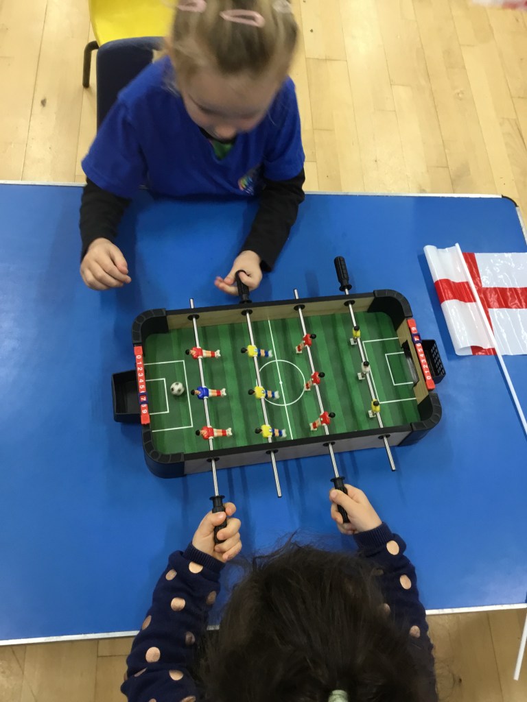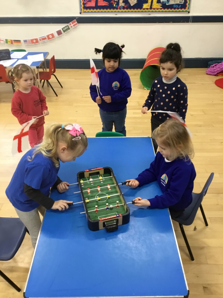 As it is currently the World Cup, we have had a football themed week at preschool. The children have enjoyed playing football, football themed air hockey and table football. We have also looked at different flags and spoke to the children about where they are from or where in the world they have family living.